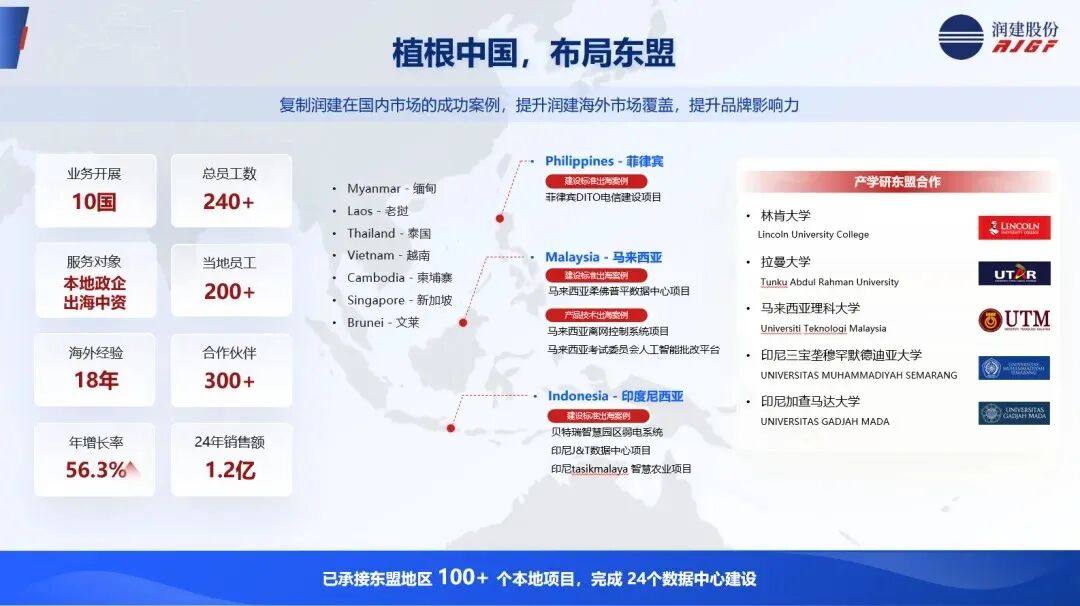 作为人工智能行业模型及算力服务商,润建股份积极开拓东盟市场,深入东盟国家本地化行业场景,坚持以科技创造价值,推动数智化成果落地,形成了从智算基础设施、行业大模型到智能体应用的AI服务能力,目前已承接东盟超100个项目,拥有240多名海外员工,服务本地政企和中资出海企业。